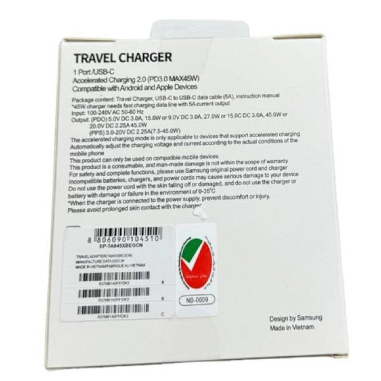 شارژر کپی سامسونگ سوپر فست 45 وات مدل Travel Adapter Super Fast 45W Type-C این شارژر دیواری دارای فناوری PD 3.0 است که با استفاده از آن می توانید دستگاه خود را با سرعت بیشتر شارژ کنید. شدت جریان خروجی این شارژر برابر با 5 آمپر است که می توان از آن برای شارژ کردن تبلت هم استفاده کنید. برای این شارژر از چیپ هوشمندی استفاده شده تا با اتصال دستگاه به صورت خودکار جریان مناسب را برای دستگاه تامین کند. درگاه خروجی این محصول هم از نوع USB-C است. البته همراه با این شارژر یک کابل تبدیل USB-C به USB-C به طول 1.8 متر هم ارائه میشود. این شارژر سایر محصولات و موبایل های سری 2019 به بالا و گوشی هایی که توانایی شارژ سوپرفست را دارند پشتیبانی می کند.